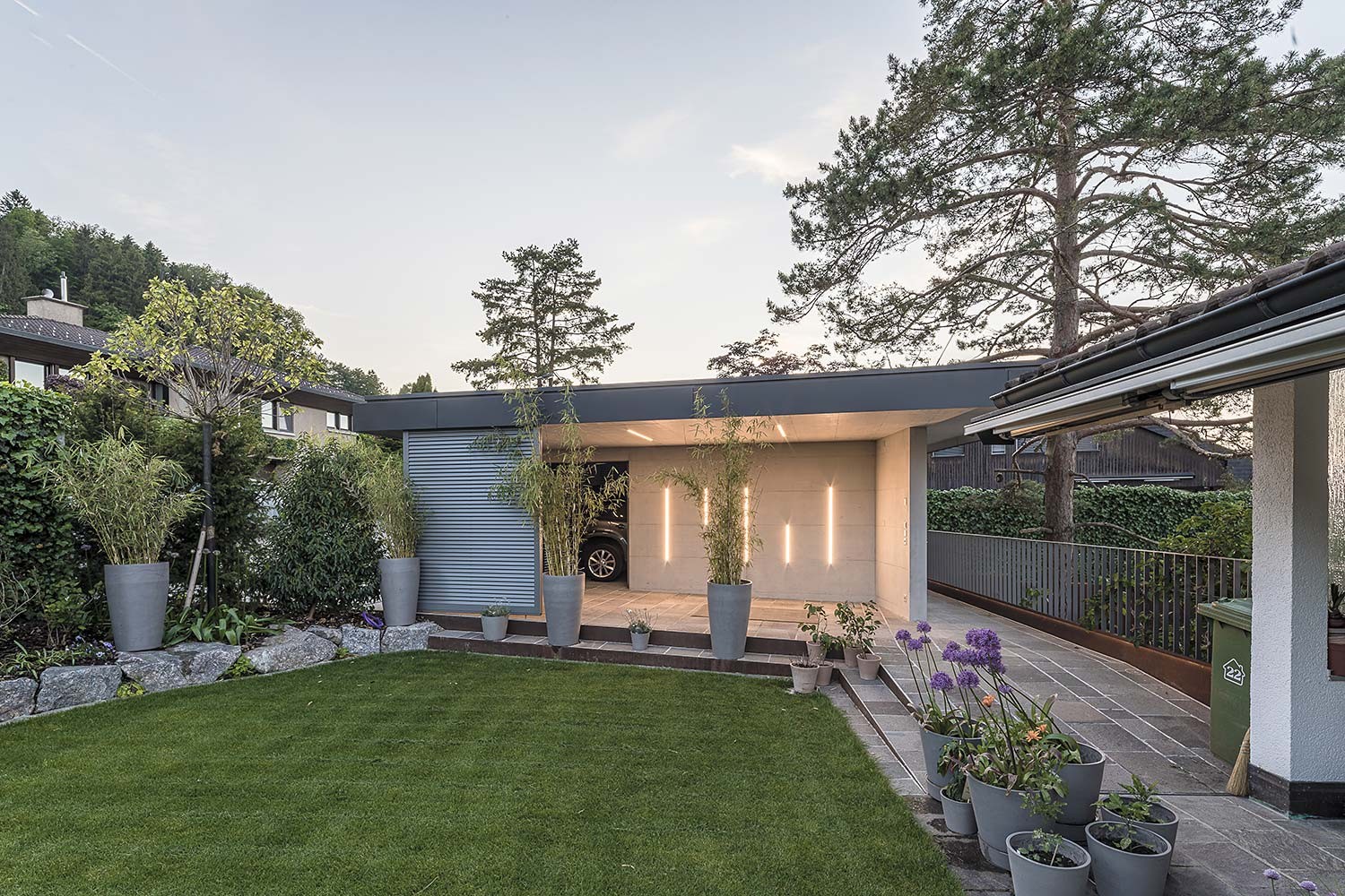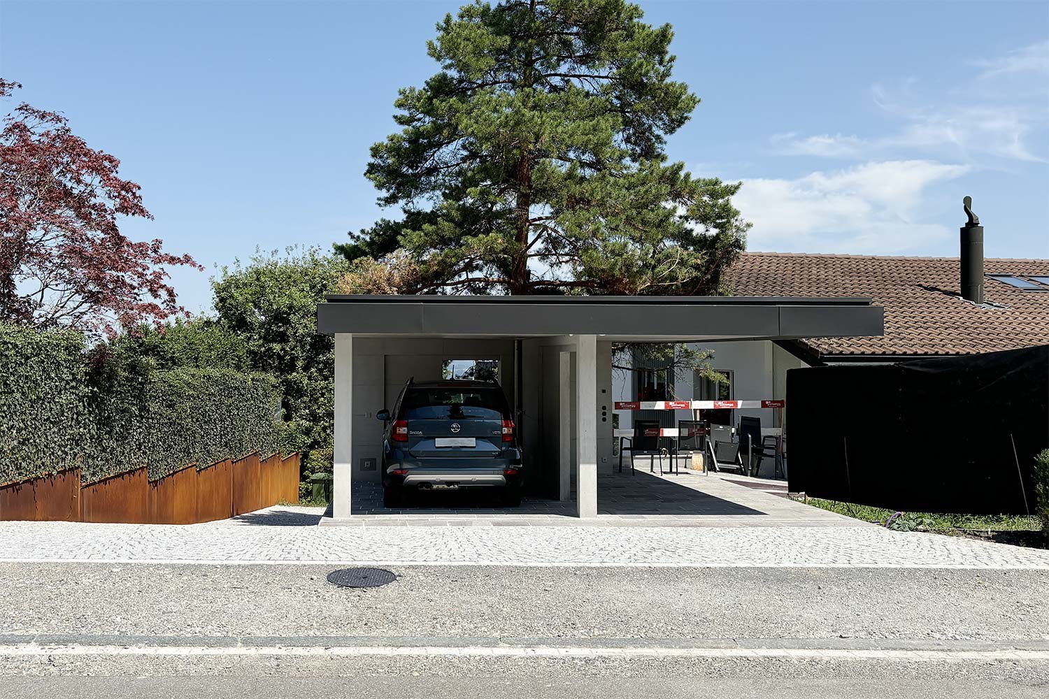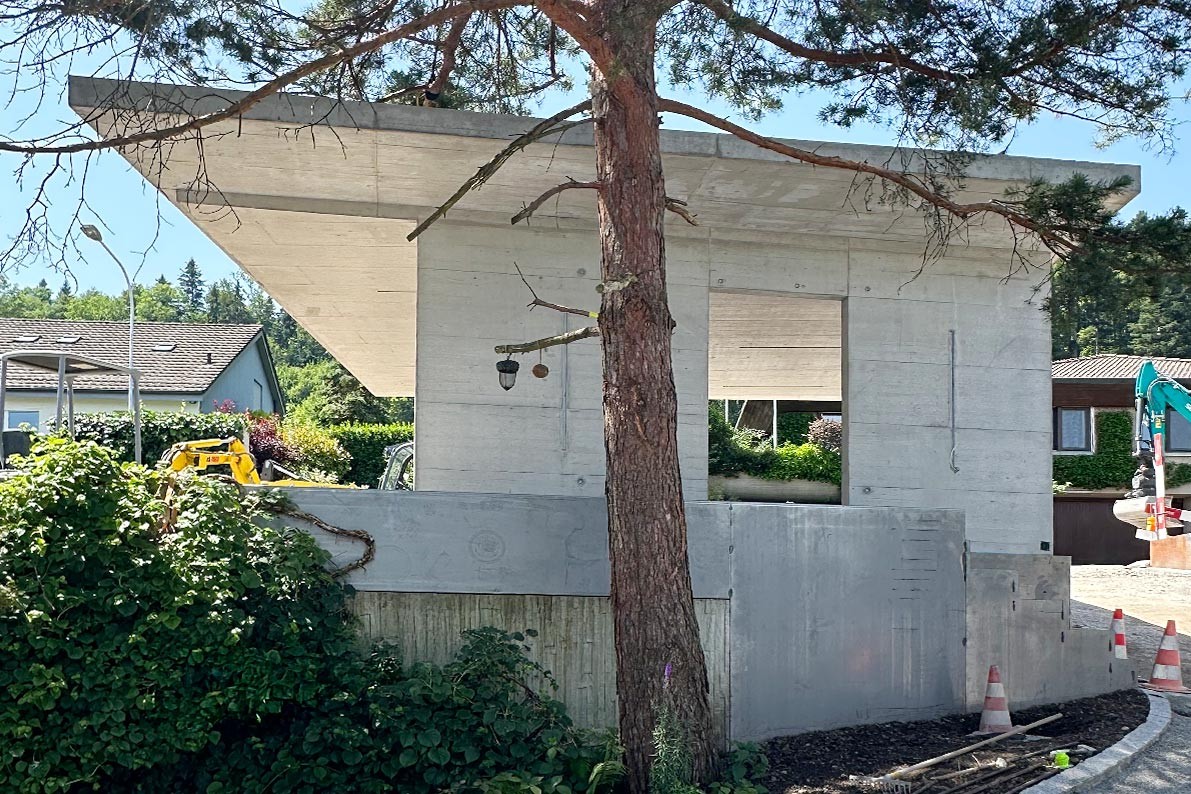 In der Forch durften wir die Planung für einen Carport übernehmen. Die Betonarbeiten wurden in Sichtbetonqualität mit Tafelstruktur ausgeführt.