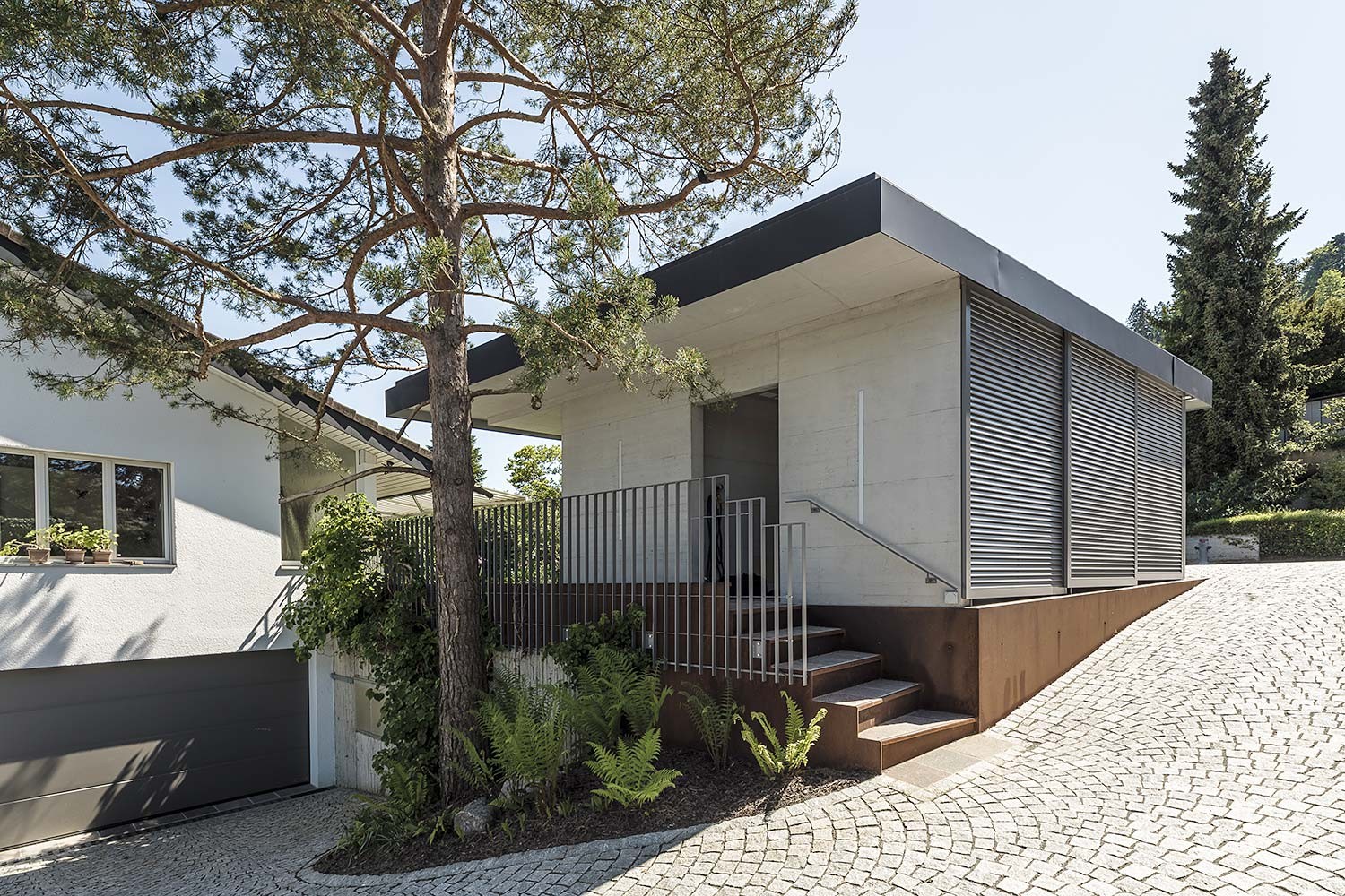 Das gut drei Meter auskragende Dach ist ein besonderes Highlight, das nicht nur optisch beeindruckt, sondern auch hohe Anforderungen an die statische Planung und Ausführung stellte. Das Projekt ist ein gutes Beispiel für moderne Architektur im Kleinen.
