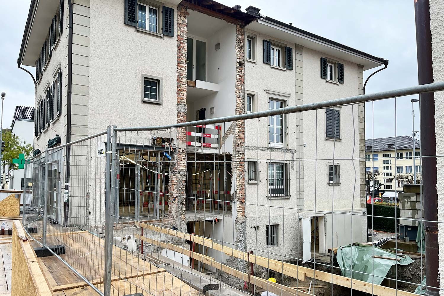 Die direkte Lage der neuen Aussenwände im Untergeschoss an der Zürcherstrasse stellte hohe Anforderungen an die Bauausführung. Um eine Beeinträchtigung des Strassenraums zu vermeiden, waren komplexe bauliche Massnahmen erforderlich.