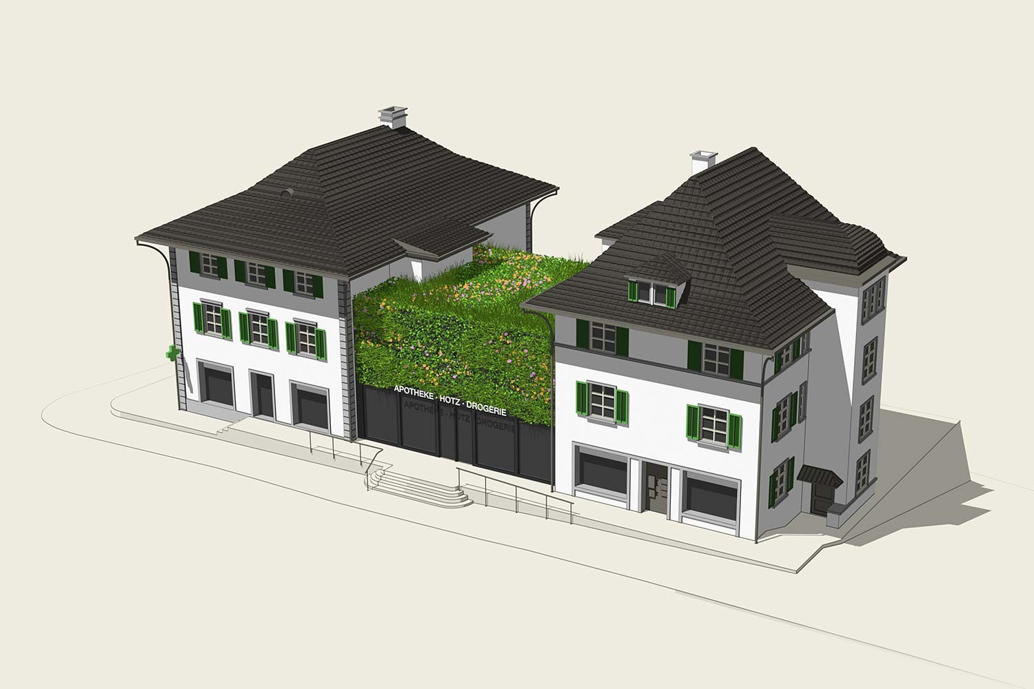 Die bestehenden Liegenschaften an der Zürcherstrasse 174 und 176 in Küsnacht werden um einen neuen Verbindungsbau erweitert. Dieser umfasst eine Vergrösserung des Untergeschosses sowie zusätzliche Obergeschosse. Unter anderem ermöglicht der Erweiterungsbau den Einbau eines modernen Medikamentenroboters, der die Arbeitsabläufe für die Mitarbeitenden der Apotheke Hotz erleichtern soll.