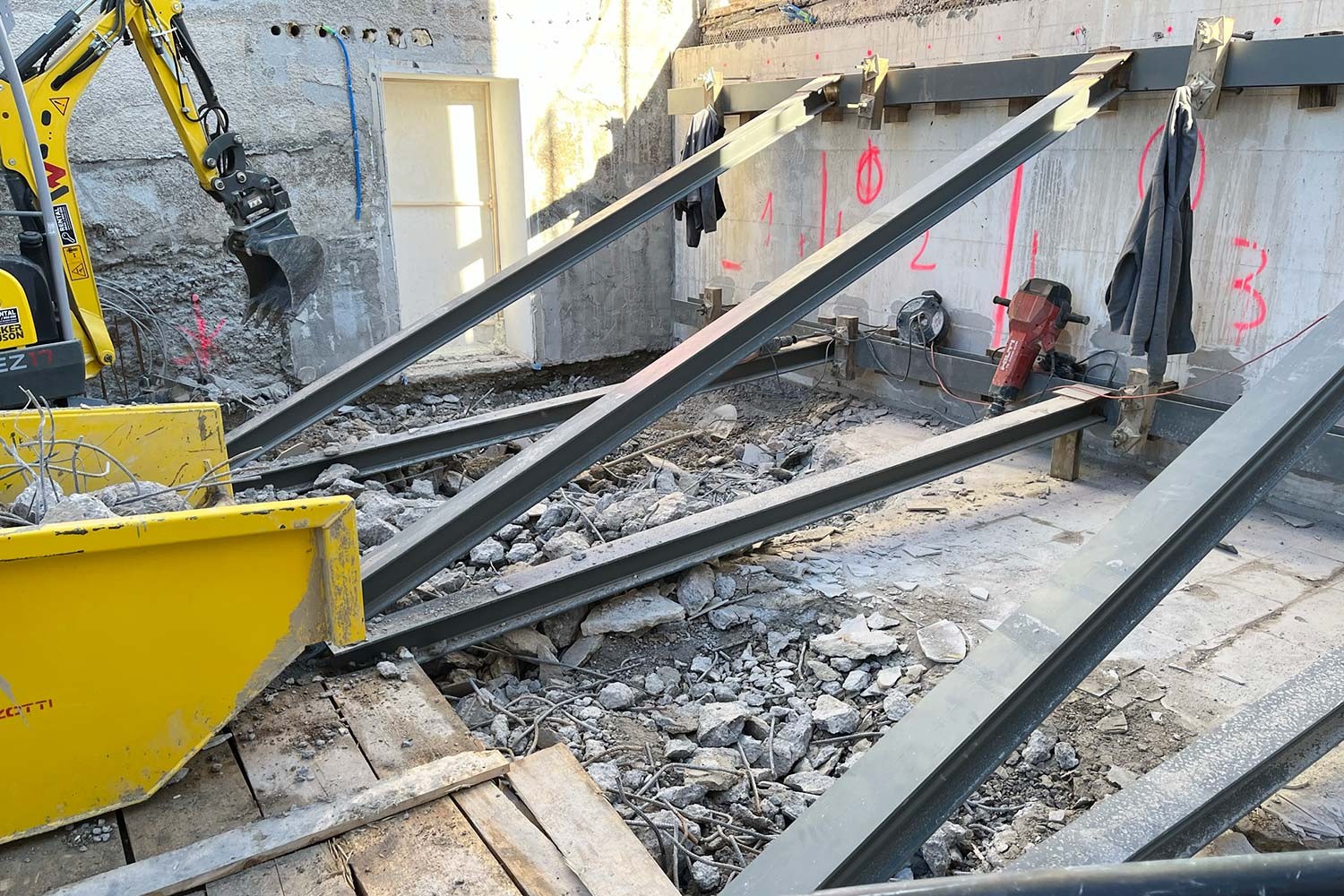 Im Erdgeschoss werden die bestehenden Ladenflächen umgebaut, während in den Obergeschossen neue Büro- und Praxisräume entstehen. Dies erfordert sowohl neue Tragwerksbauteile als auch die statische Ertüchtigung bestehender Strukturen zur Aufnahme der zusätzlichen Lasten.