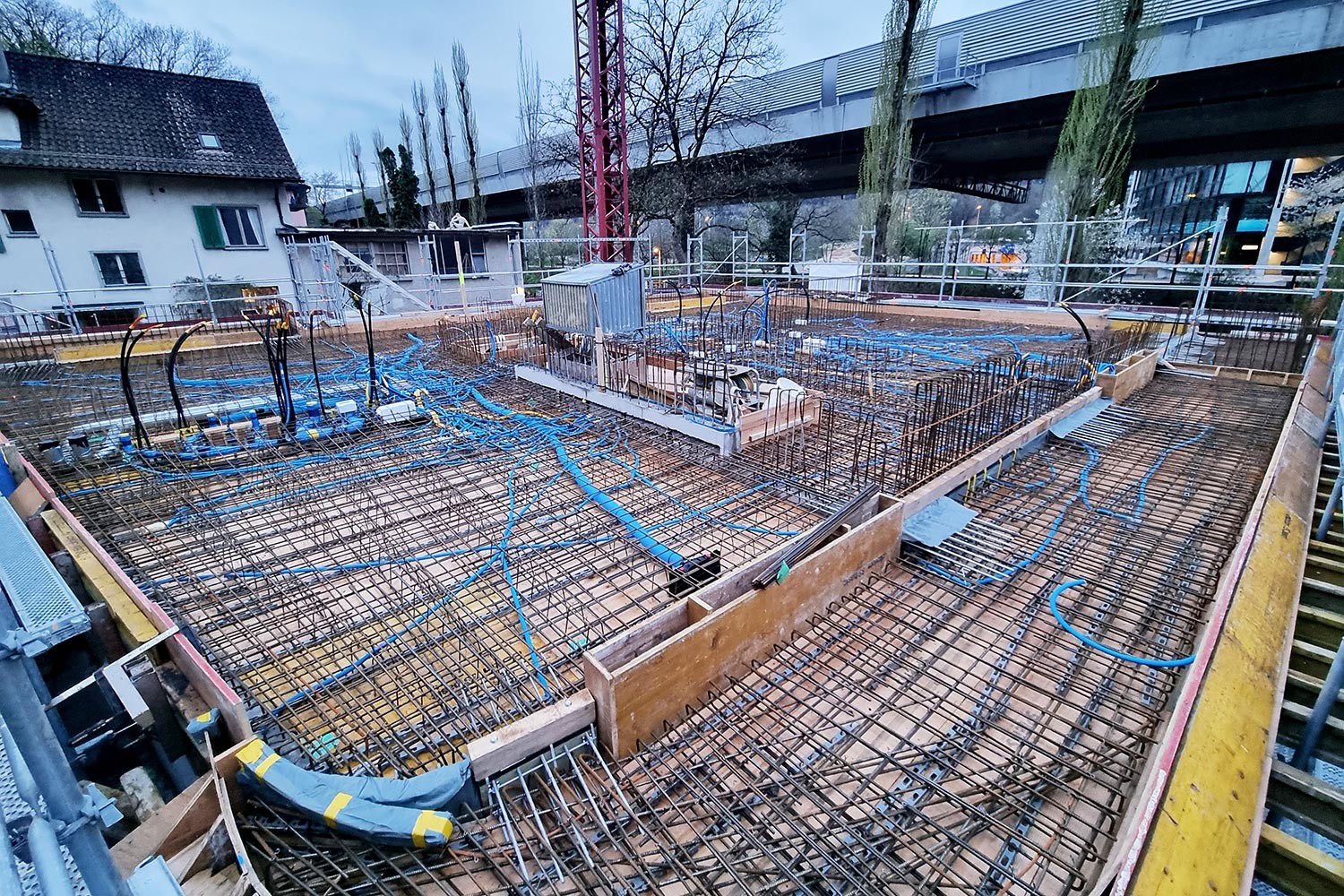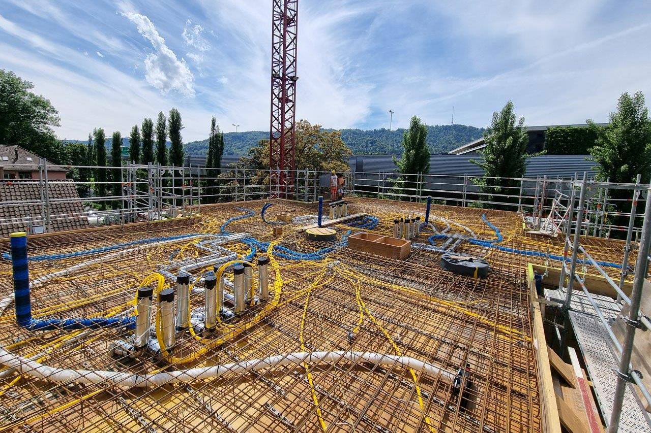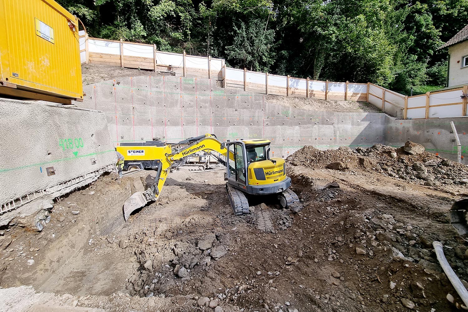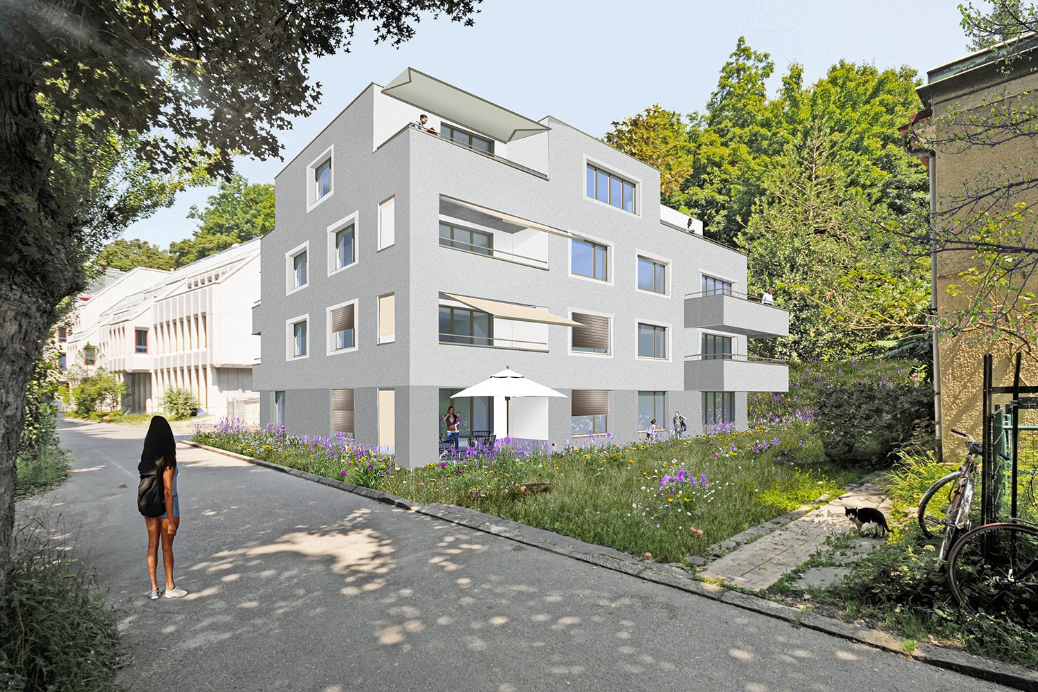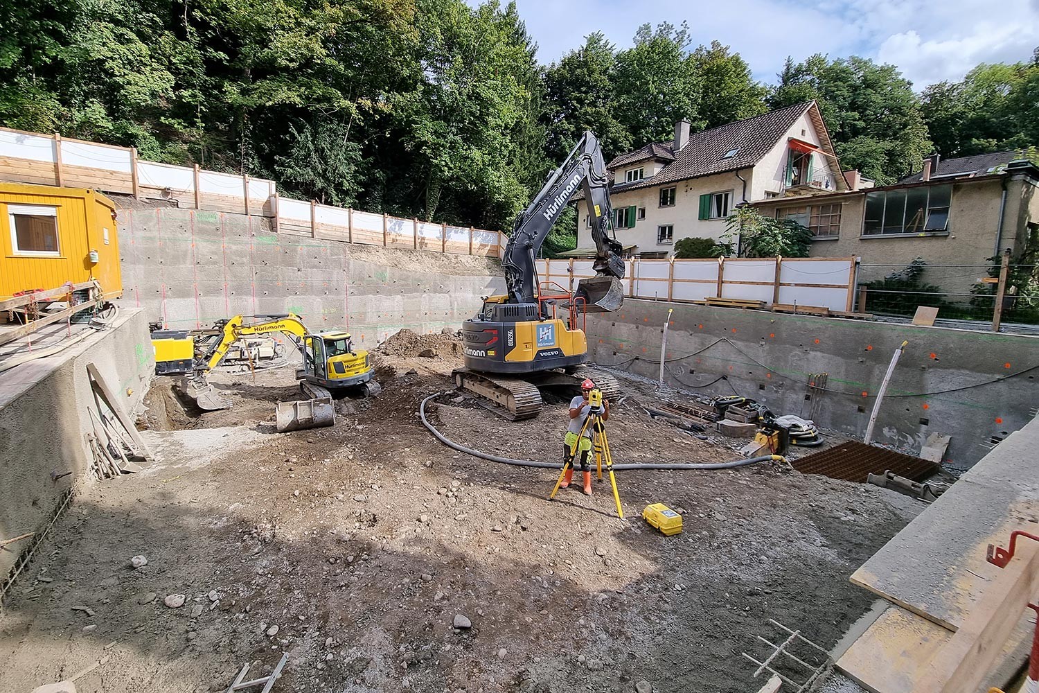 Das fünfgeschossige Mehrfamilienhaus mit einem Untergeschoss wurde in Massivbauweise erstellt. Die Oberflächen des Treppenhauses wurden in Sichtbeton realisiert. Die hangseitig bis zu 7.5 m tiefe Baugrube wurde allseitig mit Nagelwänden gesichert. Diese wurde teilweise senkrecht ausgeführt, um einhäuptig mit den Untergeschosswänden daran zu schliessen.