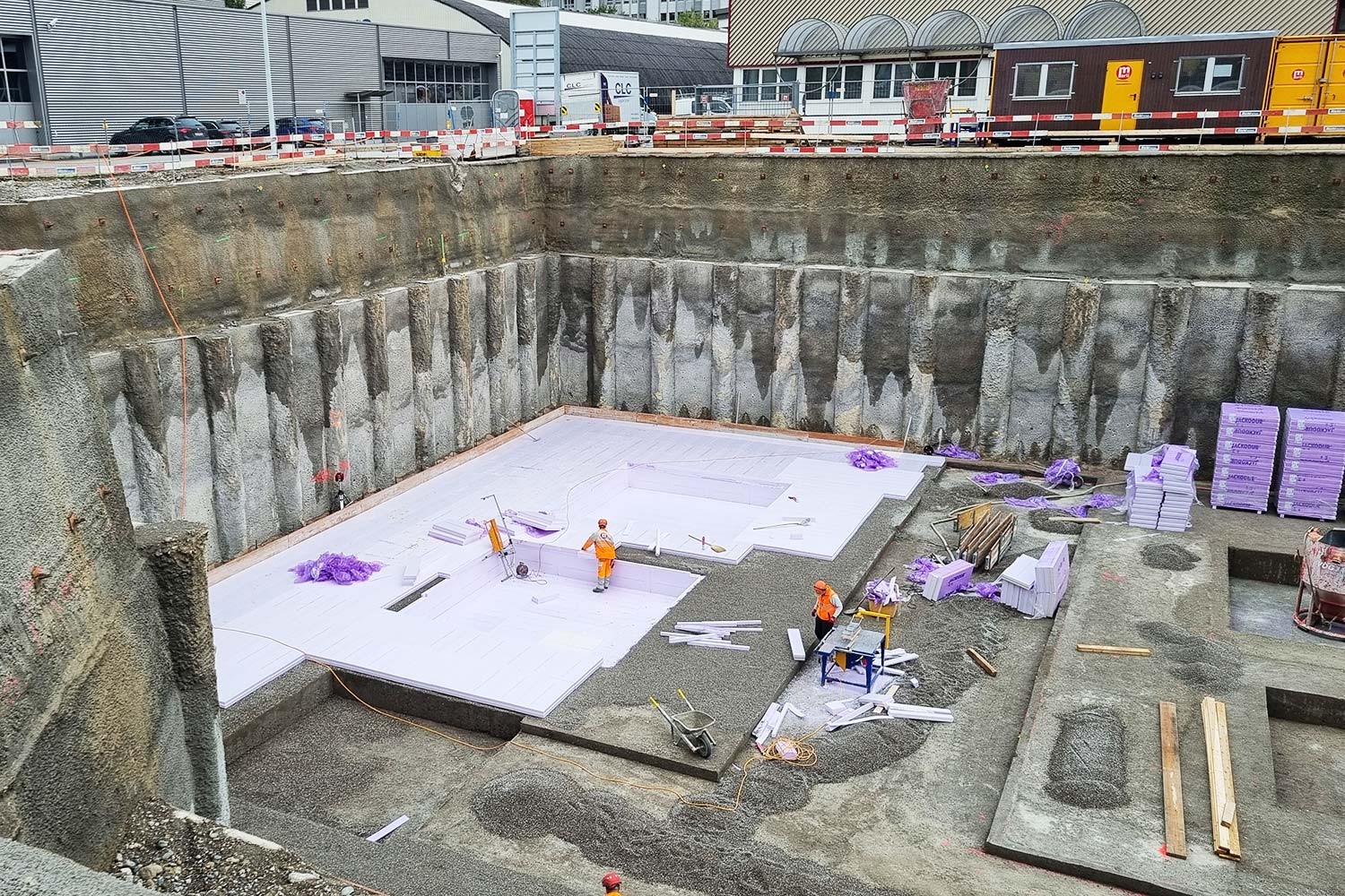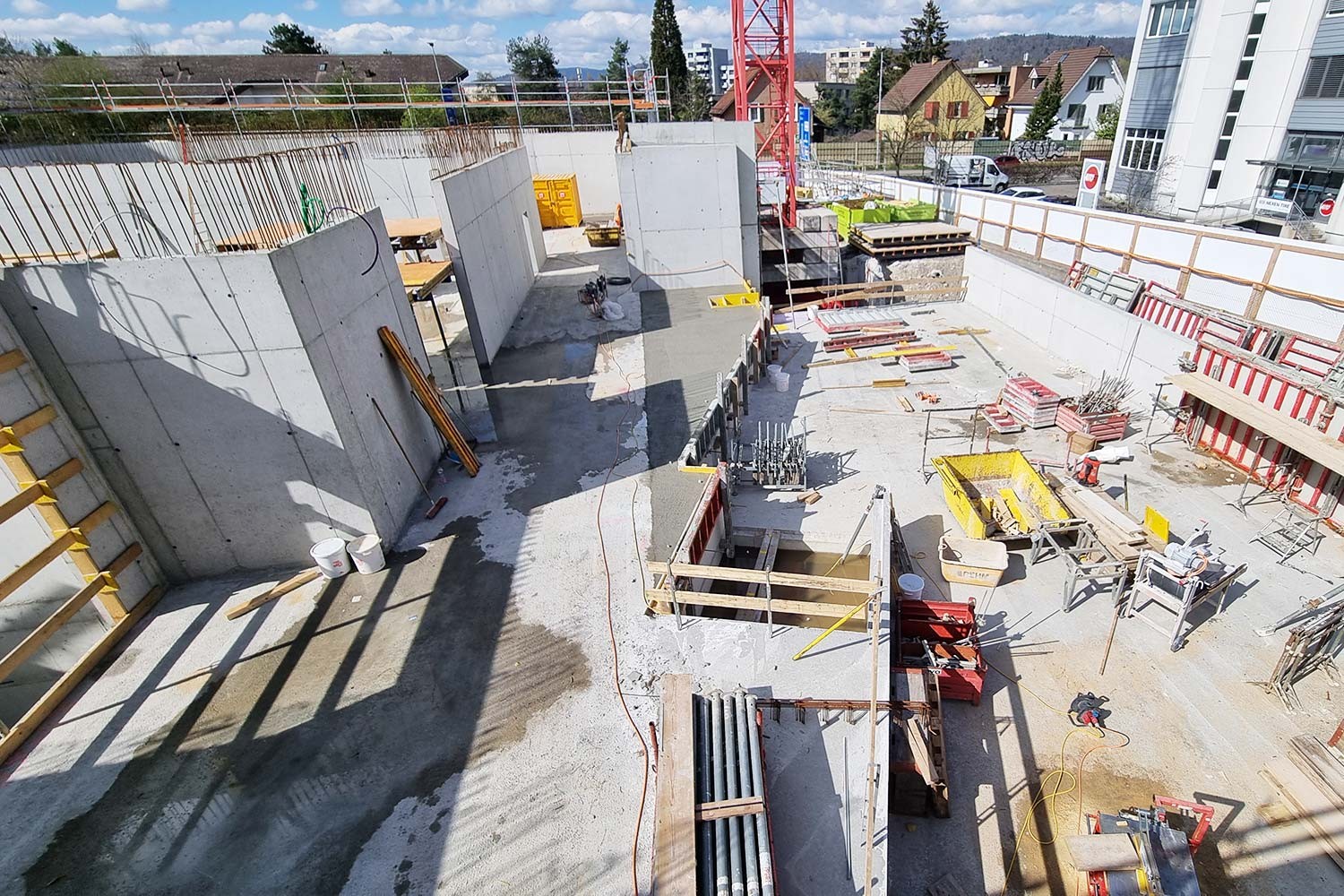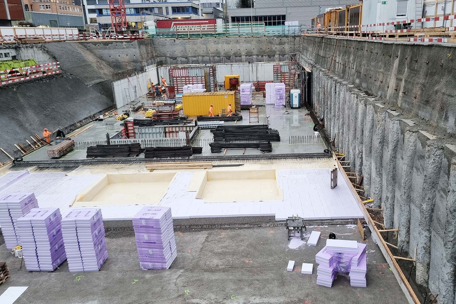 Besondere Anforderungen stellten die hohe Wasserdichtigkeit und die Erdbebensicherheit: Das gesamte Untergeschoss wurde als «gelbe Wanne» mit einer Frischbeton-Verbundfolie realisiert. Für die Erdbebensicherheit gilt Bauwerksklasse S, ausgelegt auf eine Wiederkehrperiode von 4’000 Jahren.